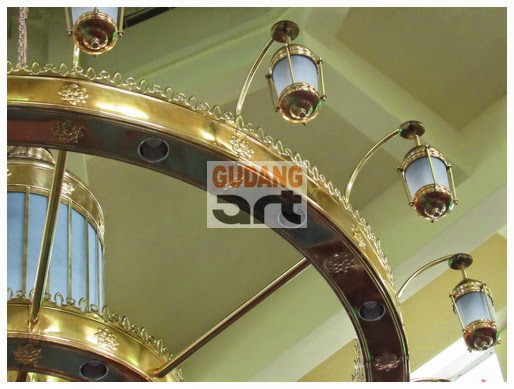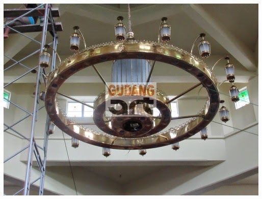 Lampu Masjid Nabawi, GudangART- Pembuatan dan pemasangan lampu gantung kuningan berwarna kuning ke emasan dengan teknik coating Gold berbahan dasar logam kuningan merupakan bentuk replika lampu gantung masjid Al Nabawi-Madinah yang berlokasi di Masjid Agung Tanjung pinang dengan dimensi ukuran Diameter 4m dan tinggi 3,5m, gambar di bawah ini adalah proses instalasi lampu gantung tersebut.