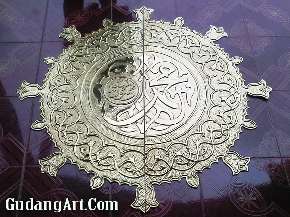 Progress pembuatan ornamen Pintu Masjid : Pengrajin kuningan saat menyelesaikan bentuk ornamen kuningan replika pintu masjid Nabawi sudah memasuki tahap penyelesaian ornamen kuningan pada pintu masjid dengan spesifikasi ukuran diameter 95cm, plat kuningan 0,8mm dengan bentuk textur timbul., Finishing polish Gold.Untuk mengetahui harga dan konsultasi pintu masjid : 0812.2771.9200-0818.0430.9449-0274.8579200